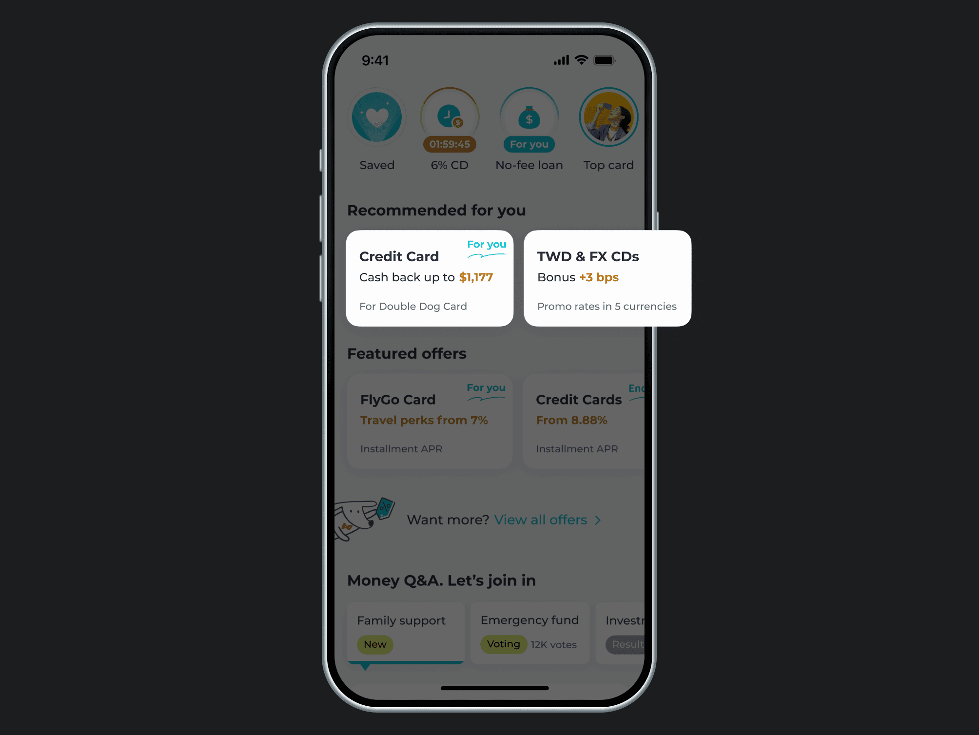 Turn Q&A into quick voting on relatable money topics to encourage participation and naturally connect users to related products.